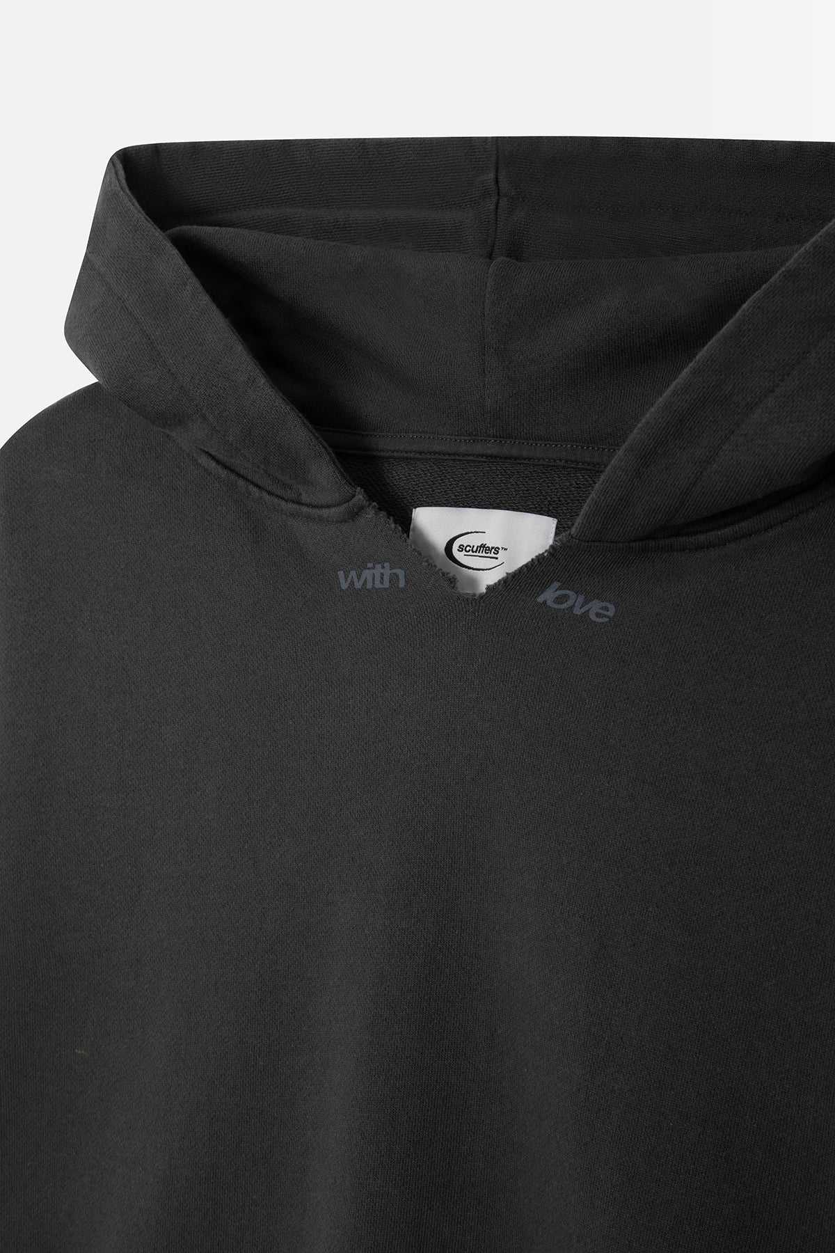 Black ultra-heavyweight oversize, boxy fit unisex hoodie. Broken detail at neck opening with "with" & "love" design screen-printed in tonal black on each side of collar. "Scuffers" design silkscreened on upper back from shoulder to shoulder. Stitching on back of hoodie.