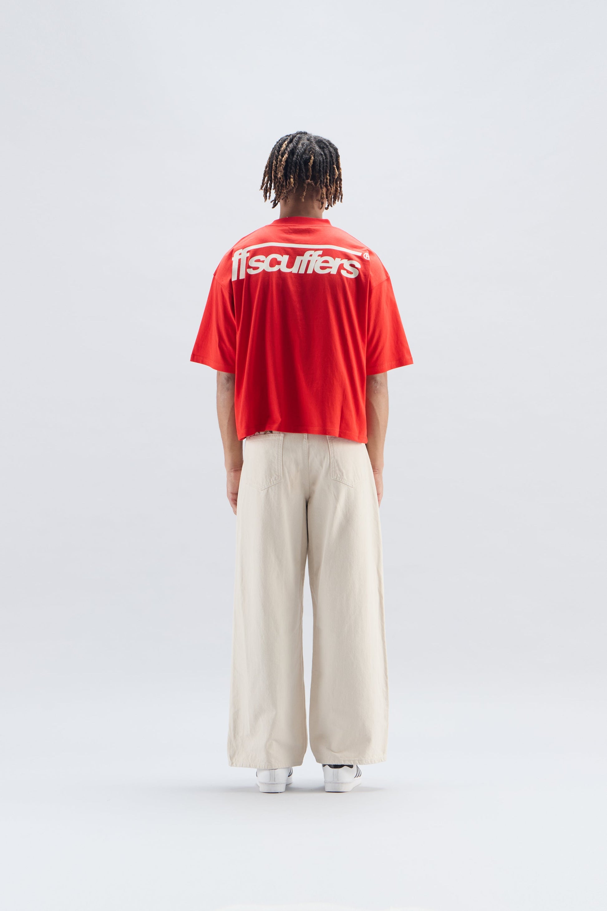 T-shirt oversize à manches courtes rouge vif orné du logo « Scuffers » blanc en gras au dos. On retrouve également des détails de marque sur le devant, notamment l'emblème « Scuffers Studios » sur la poitrine gauche. Une combinaison audacieuse de couleurs et de logos pour un look streetwear moderne.