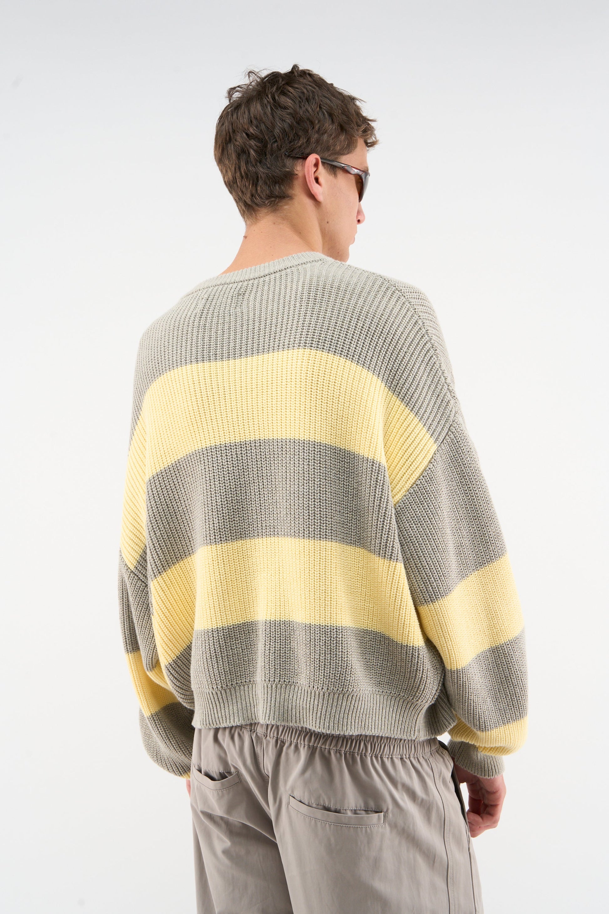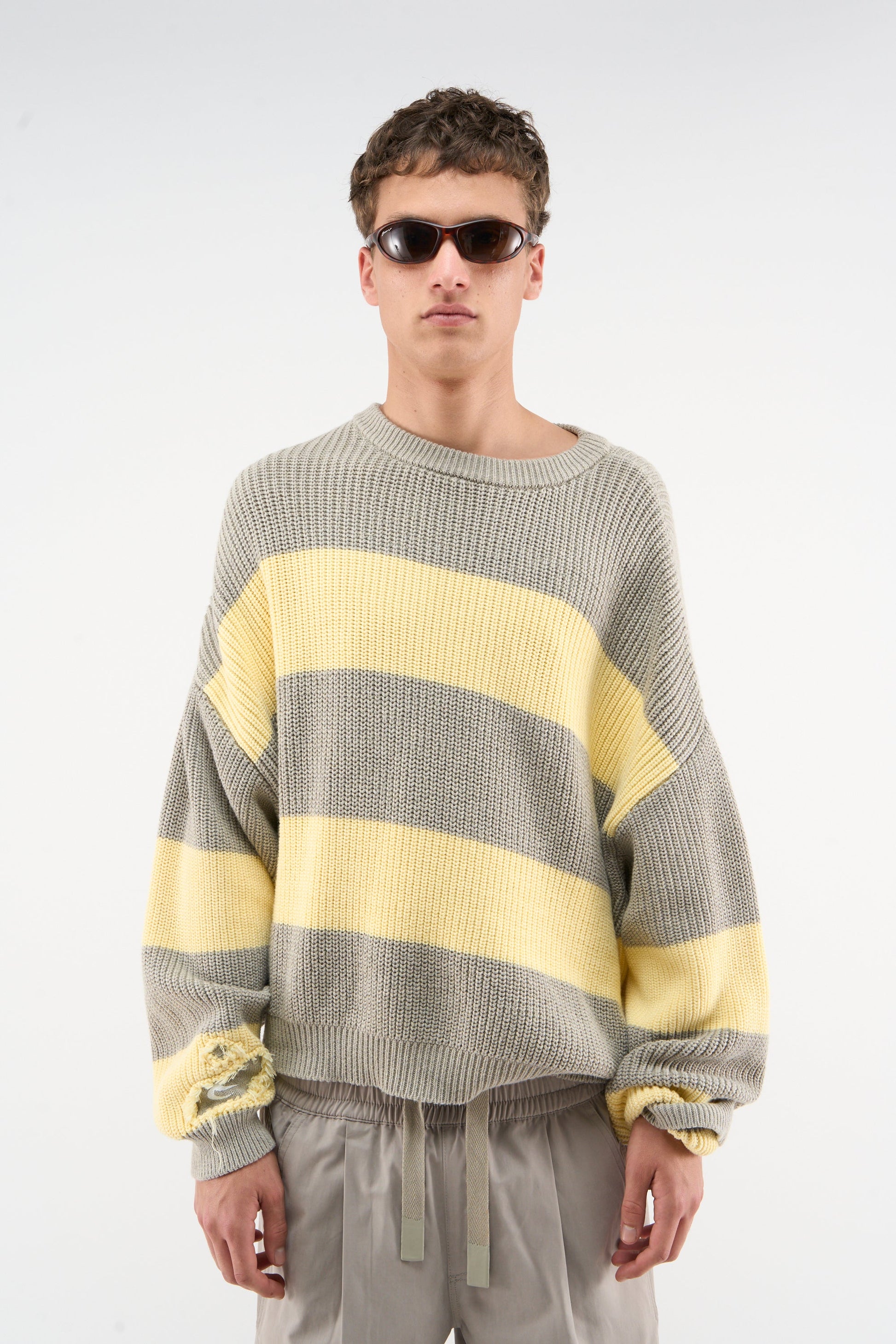 Tricot jaune et gris à trous