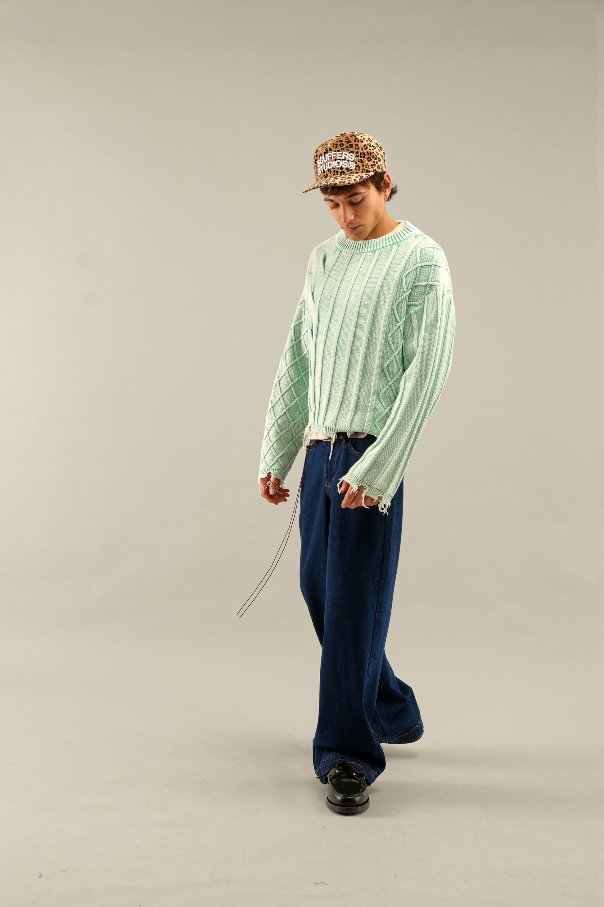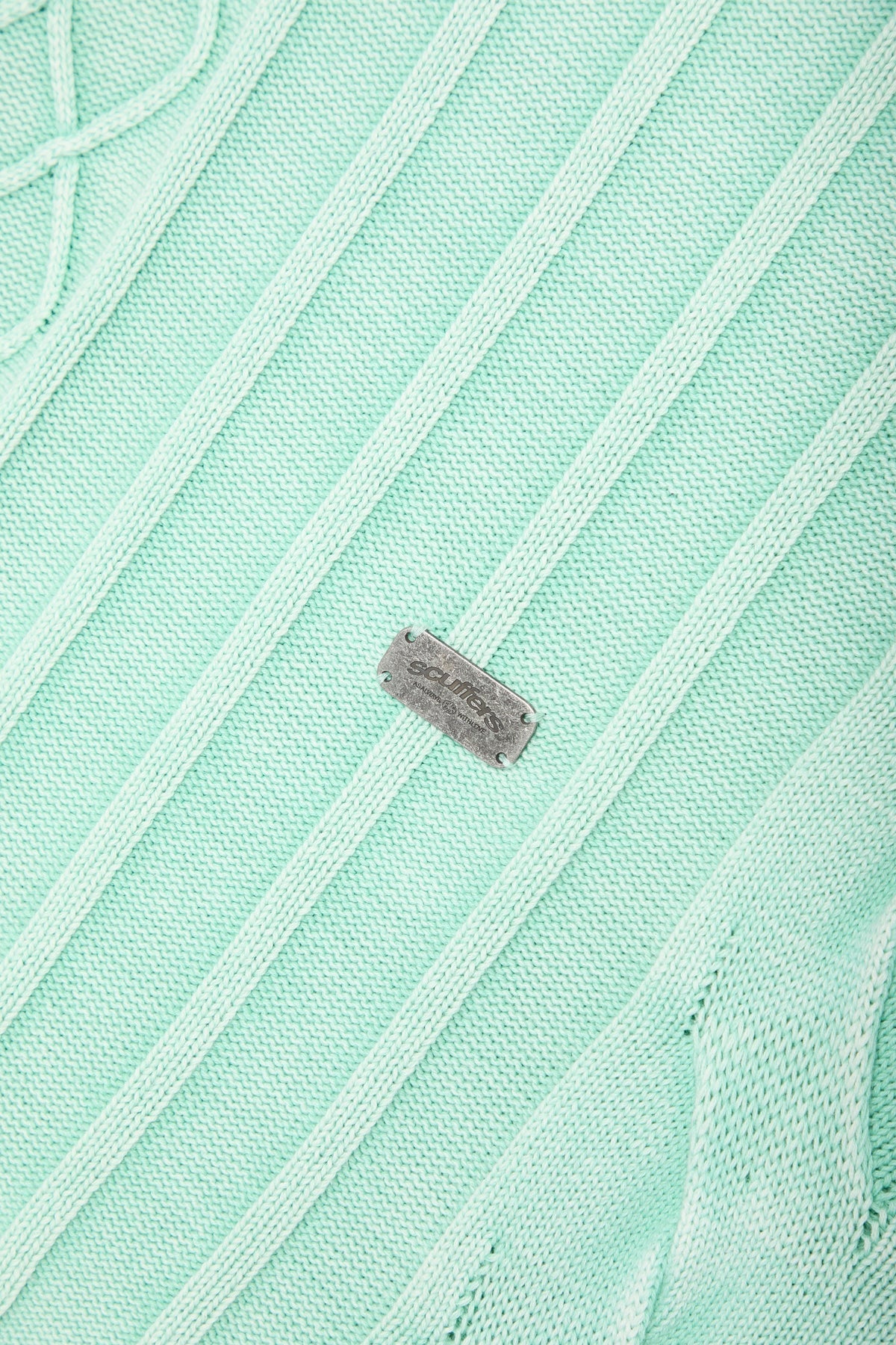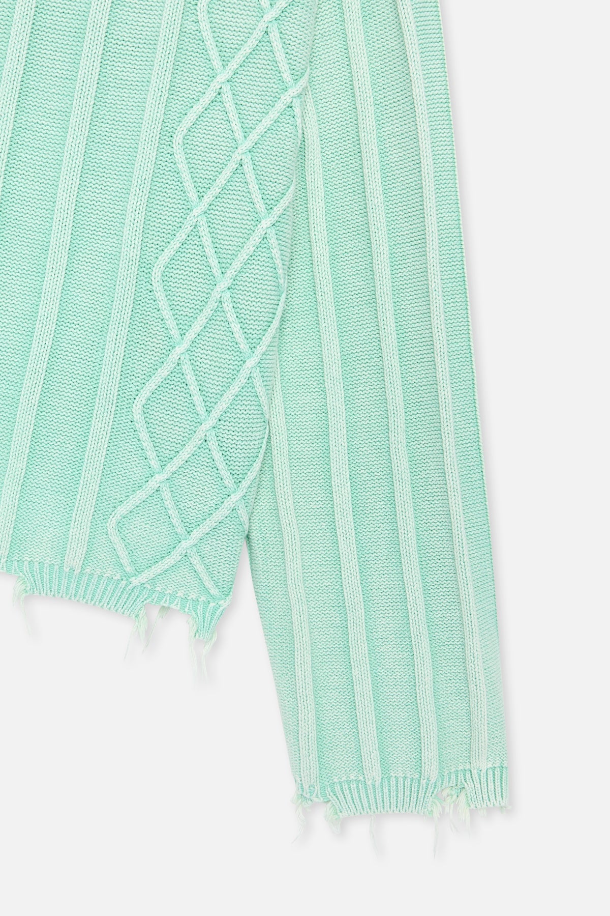 Pull en maille vert menthe délavé à l'aspect usé, mêlant torsades et côtes. Confectionné dans un tissu doux et mi-lourd, il offre une coupe décontractée. Ses bords francs à l'ourlet et aux poignets lui confèrent un style vintage. Col rond côtelé et logo discret en métal au dos.
