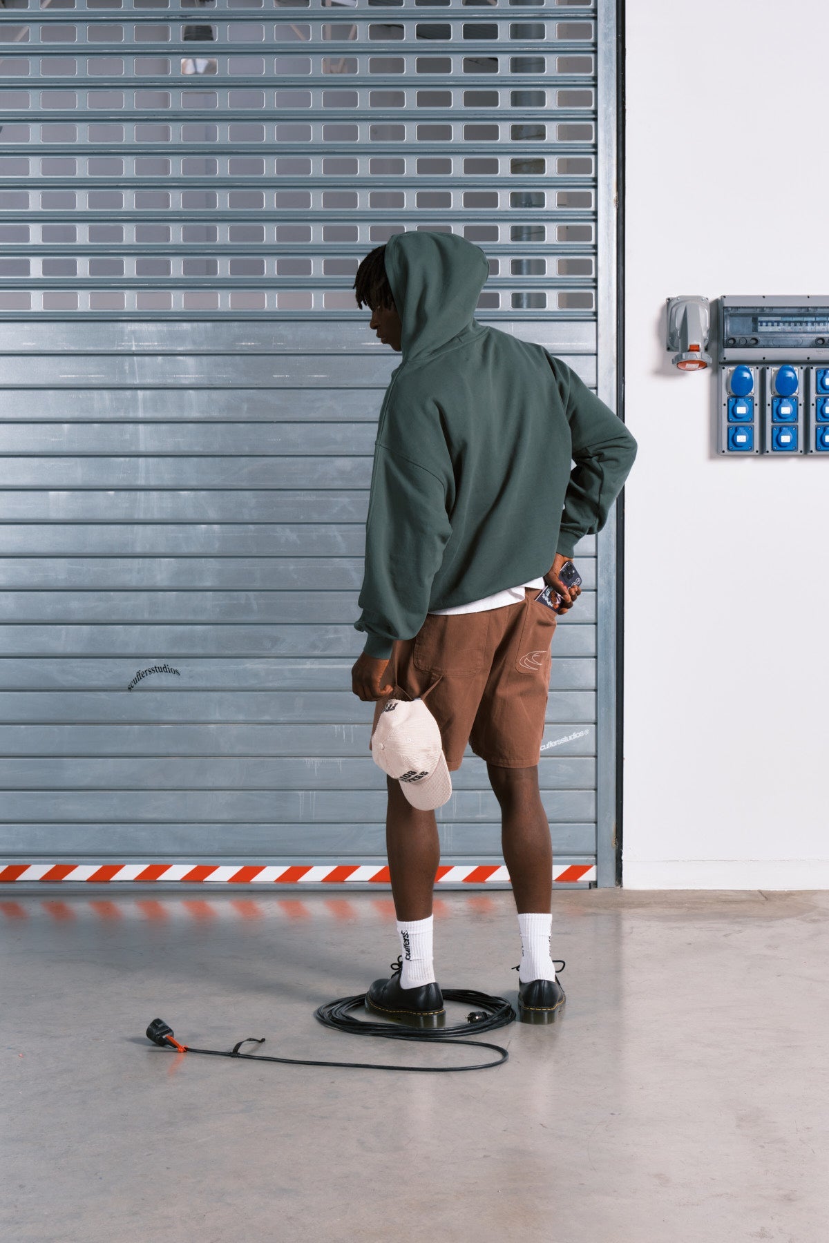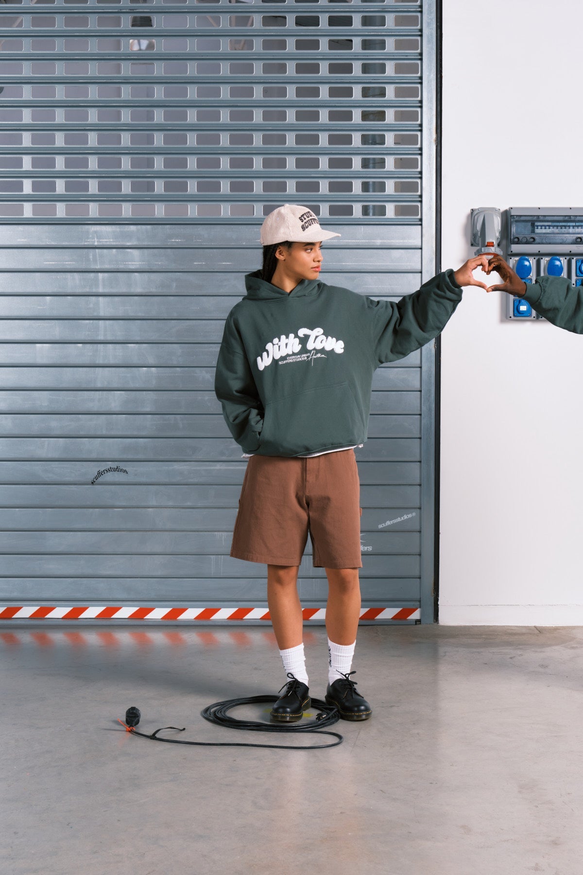 Casquette en velours côtelé écru à visière plate. Inscription « Scuffers Studios » brodée en vert foncé. Broderie FF WL à l'arrière.